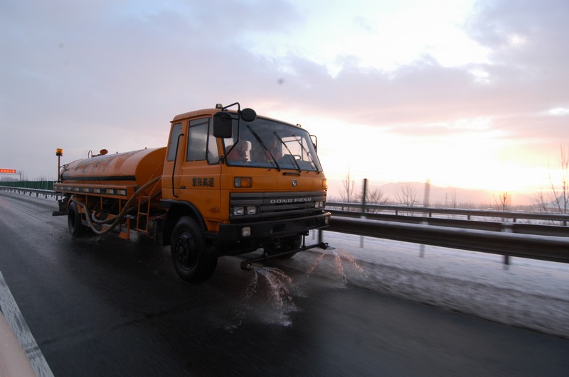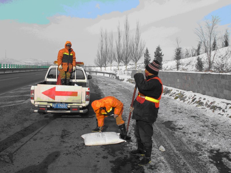 從11月10日早晨開始,養(yǎng)護(hù)人員全部就位待命,各灑布車裝滿融雪劑,準(zhǔn)備隨時(shí)灑布。公司安排了兩輛巡查車,分別向東西兩個(gè)方向開始不間斷巡查,及時(shí)掌握最新雪情動(dòng)態(tài)。晚上,隨著大雪降臨,養(yǎng)護(hù)部門本著“先重點(diǎn)路段,后一般路段”的原則開始在全線噴灑溶雪劑,以確保匝道、爬坡路段降雪及時(shí)融化,避免造成車輛“趴窩”,影響通行。到11日白天,又安排人員對重點(diǎn)路段進(jìn)行人工灑布,并派4臺除雪車上路推鏟積雪。12日,在降雪停止后,又安排200多人上路徹底清除路面積雪。由于除雪及時(shí),京張高速一直處于暢通狀態(tài),除由于進(jìn)京方向八達(dá)嶺高速積壓車輛造成車輛擁堵到京張路段,為保證安全,高速交警暫時(shí)封閉上口外,京張高速?zèng)]有因降雪而封閉,做到了省廳要求的24小時(shí)雙向四車道暢通,48小時(shí)路面無積雪。